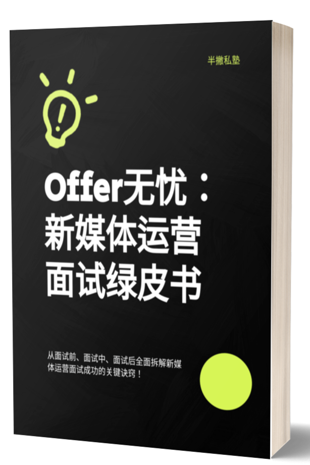 我这里有原创的《Offer 无忧:新媒体运营面试绿皮书》,其中包括了适用于所有岗位的通用面试问题,也包括了专门针对运营岗位的面试话术,都是经过 8 年多面试辅导迭代出来的版本,需要的同学,一键三连,评论区找我。