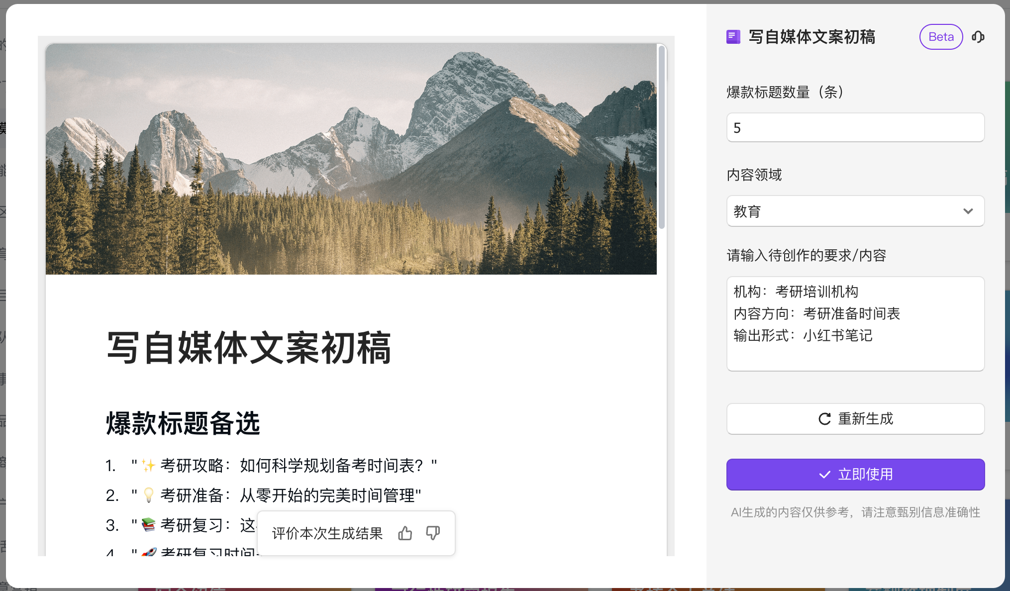 我们以写新媒体文案作为例子,这是还是利用金山文档,在内置 AI 模版直接选择“写自媒体文案初稿”的模版,在右侧的配置中选择爆款标题数量,内容领域,并且填写具体的创作内容要求,等待片刻,左侧就可以直出文章了。