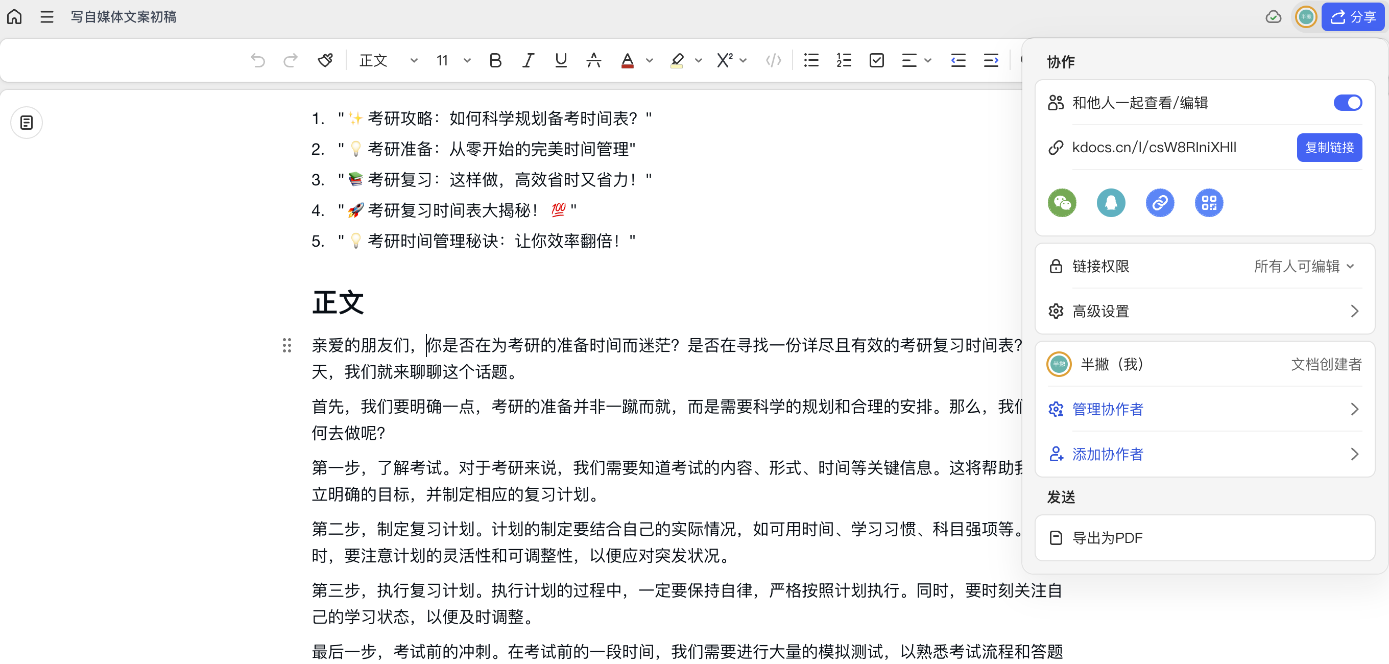 拿到文章以后,你也可以进行改写、扩写、续写、润色等等,全部完成后,还可以生成共享链接,直接分享给 HR。