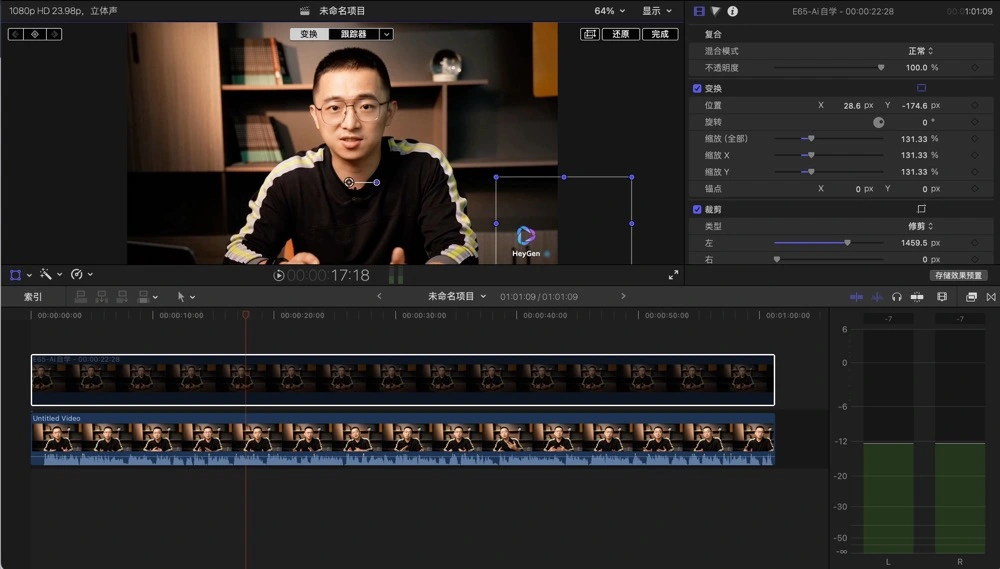 因为Heygen给我的视频做了剪辑,而我原本的视频是更大的,所以只需要在剪辑软件取1个右下角的画面截图,裁剪一下套到视频的上面,就盖住了这个水印了。